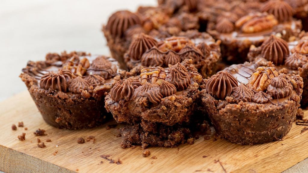 KEKSIPOHJA: Vatkaa voi ja sokerit kuohkeaksi vaahdoksi. Lisää seokseen kananmuna. Yhdistä vehnäjauhot ja leivinjauhe keskenään. Raasta sitruuna. Lisää kuivat aineet ja sitruunan kuoriraaste voi-sokeriseokseen. Purista myös mukaan sitruunan mehu. Rouhi suklaa ja pekaanipähkinät. Lisää myös suklaa ja pekaanipähkinät taikinan joukkoon esim. puuhaarukalla käännellen. Laita taikina hetkeksi jääkaappiin. Voitele muffinssipellin kolot voilla. Jaa keksitaikina muffinivuokien pohjalle ja reunoille. Esipaista pohjia 170 asteisessa uunissa noin 10 minuutin ajan.