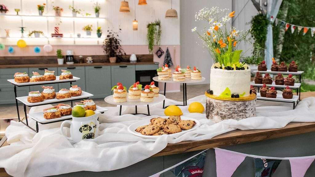 KORISTEET+KORISTELU: Kaada vesi kulhoon, lisää vaniljakreemijauhe ja vatkaa vatkaimella, kunnes sakenee ja paksuuntuu. Vatkaa vispikerma vaahdoksi. Nostele kermavaahto kreemin sekaan ja sekoita vatkaimella tasaiseksi. Kuorruta kakku: aloita päältä tasoittamalla kansi. Lisää reunoille ja vedä raapalla tasaiseksi, mutta niin että kakku kuultaa runoista läpi joistakin kohtaan. Koristele kakku: Leikkaa sitruuna puoliksi ja leikkaa toinen puolikas ohuiksi ympyröiksi, leikkaa toinen puolikas vielä puoliksi ja palo siitä hieman paksumpia siivuja, jotka leikkaa vielä kahtia. Palo puolet lakuista erikokoisiki paloiksi. Asettele sitruunat kakun päälle ympäri, lisää lakuja ja viimeistele sitruunamelissalla. Nosta isomaltoosi lehdet kakun päälle keskelle sekä kakun alareunalle.