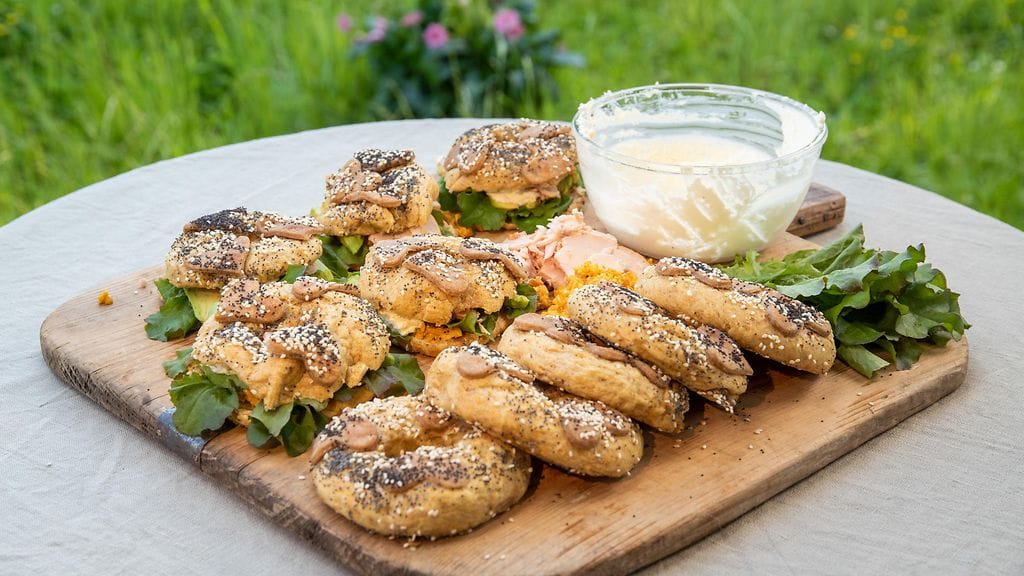 RUIS-PORKKANABAGELIT: Kuori ja raasta porkkana. Liuota hiiva kädenlämpöiseen veteen. Lisää hunaja, suola ja 2 dlvehnäjauhoja. Vatkaa hetki. Lisää ensin porkkanaraaste ja sitten ruisjauhot ja loput vehnäjauhot.Vaivaa yleiskoneessa reilu 5 minuuttia Jätä taikina kohoamaan noin 35 minuutiksi. Pyöritä taikinasta pötkö ja jaa se 10 osaan. Pyöritä osa kerrallaan palloksi ja paina peukalolla keskelle reikä. Venytä reikää kevyesti ja muotoile bagelista tasainen. Anna kohota leivinpaperilla vuoratun uunipellin päällä 10–15 minuuttia. Kiehauta 2 l vettä kattilassa ja lisää hunaja. Keitä bageleita vedessä noin minuutti per puoli. Nosta bagelit pellille, voitele vesi-hunajaseoksella kevyesti ja paina ruiskeksi kevyesti bagelin päälle. Voitele ruiskeksejä myös hieman ja ripottele pinnalle seesamin- ja unikonsiemeniä. Paista 225 asteessa 15–20 minuuttia.