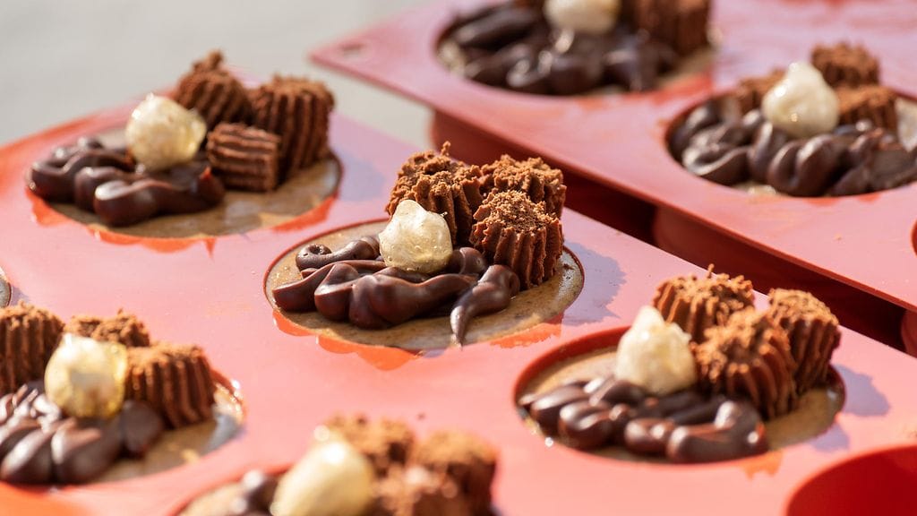MUROTAIKINAPOHJA: Laita uuni lämpenemään 200 asteeseen. Yhdistä vehnäjauhot, vaniljasokeri, kardemummajauhe, kaakaojauhe ja hasselpähkinäjauhe. Vatkaa huoneenlämpöinen voi ja sokeri vaahdoksi sähkövatkaimella. Sekoita joukkoon kananmuna, sitten jauhosekoitus. Jaa seos silikonimuotteihin, vähintään 12 kpl (jokainen palan tulisi painaa noin 30–35 g), painele kevyesti pienten silikonivuokien pohjiin. Huom! Jos voi on ehtinyt lämmetä, laita silikonivuoat hetkeksi jääkaappiin ennenpaistamista. Aseta vuoat valmiiksi syvälle uunipellille. Esipaista noin 10–12 minuuttia kunnes saaneet vähän väriä. Tee sen aikana juustoseos.