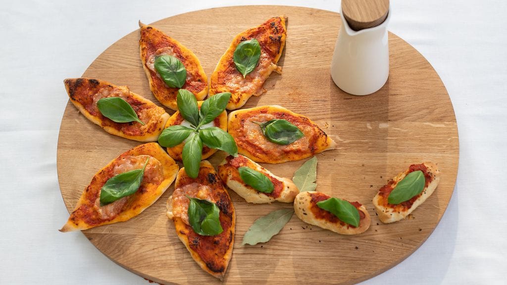 POHJA: Liota hiiva kädenlämpöiseen veteen. Sekoita joukkoon suola, oliiviöljy ja puolet jauhoista. Vaivaa loput jauhot joukkoon vähän kerrallaan, kunnes taikinasta tulee kimmoisaa. Anna taikinan kohota kaksinkertaiseksi puhtaassa ja öljytyssä kulhossa, peitettynä tuorekelmulla. Laita uuni lämpenemään 230 asteeseen ja laita sinne yksi pelti väärin päin kuumenemaan.