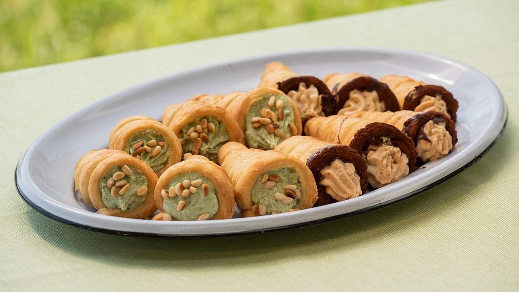 KONJAKKIVOITAIKINA: Kuutio voi ja nypi sormin tai sekoita yleiskoneella joukkoon pakkasesta otetut vehnäjauhot, leivinjauhe, suola ja sokeri. Lisää vesi, konjakki ja keltuainen. Sekoita taikinaksi niin, että voi jää vähän paakuiksi. Kääri taikina muoviin tai kelmuun. Anna taikinan levätä kylmässä vähintään 20minuuttia. Kaulitse taikina 3 x 3 eli kauli taikina suorakaiteen muotoiseksi, taittele kolmeen osaan. Käännä 90 astetta. Toista näin kaksi kertaa. Voit tarvittaessa pitää taikinaa kylmässä/pakastimessa kaulintakertojen välissä. Anna taikinan levätä kylmässä vähintään 20 minuuttia ennen sarvien muotoilua.