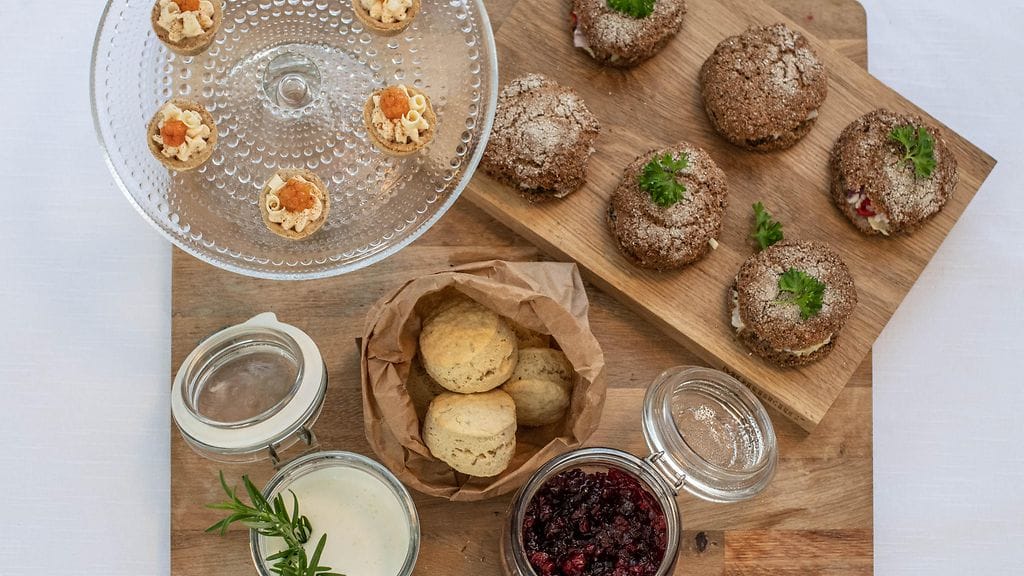 Valmista skonssit. Ota taikina jääkaapista ja kauli jauhotetulla alustalla siitä noin 2-3 cm:n paksuinen levy. Ota ympyrämuotilla (halkaisija 5 cm) taikinasta skonsseja ja aseta ne ylösalaisin leivinpaperin päälle pellille. Kaulitse lopputaikina uudelleen, jotta saat 6 kpl skonsseja. Sipaise sudilla päälle vielä hieman maitoa ja paista uunissa 12-15 minuuttia.