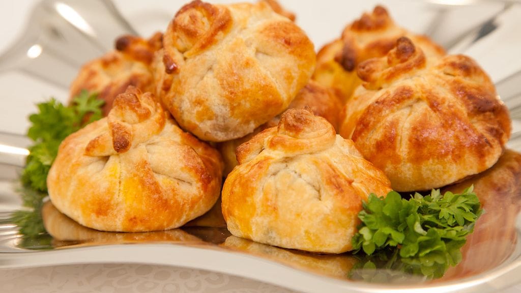 Sekoita perunamuusijauhe, vehnäjauhot ja leivinjauhe. Paloittele voi ja lisää se joukkoon. Sekoita (voi saa jäädä paakuiksi). Lisää vesi ja sekoita nopeasti sekaisin. Laita taikina jääkaappiin täytteen valmistuksen ajaksi.