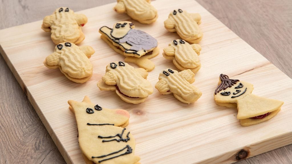 MUROTAIKINA: Lämmitä uuni 175 asteeseen. Sekoita kylmä voi, vehnäjauhot, tomusokeri ja vaniljasokeri nopeasti yleiskoneella, tai nypi käsin sekaisin. Lisää kananmunan keltuainen ja sekoita tasaiseksi. Kääri taikina kelmuun tai folioon ja laita jääkaappiin lepäämään noin puoleksi tunniksi. Kaulitse 3mm paksuksi levyksi. Tee hahmojen kaavoilla 2 kappaletta kutakin hahmoa: Muumipeikko, Pikku-Myy, Nuuskamuikkunen ja Hemuli. Paista 175 asteessa noin 10min.