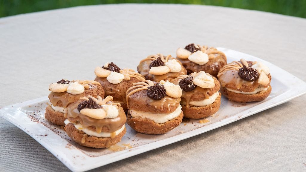 POHJA: Vaahdota huoneenlämpöinen voi sokerin kanssa vaaleaksi vaahdoksi sähkövatkaimella. Lisää kananmunat ja kerma. Sekoita hyvin. Yhdistä kuivat aineet keskenään ja lisää ne nesteiden joukkoon. Kaulitse taikina 1,5 cm paksuiseksi levyksi, käytä vehnäjauhoja apuna. Ota taikinasta 8 cm halkaisijaltaan olevalla stanssilla 8 kappaletta donitseja. Tee jokaisen taikinaympyrän keskelle 2 cm halkaisijaltaan olevalla stanssilla reikä. Kuumenna munkinpaistorasva kattilassa 175 asteiseksi. Nosta donitsit reikäkauhalla rasvaan paistumaan. Paista donitseja 1-2 minuuttia molemmilta puolilta. Voit paistaa noin kolmea donitsia yhtäaikaisesti. Nosta kypsät donitsit reikäkauhalla talouspaperin päälle.