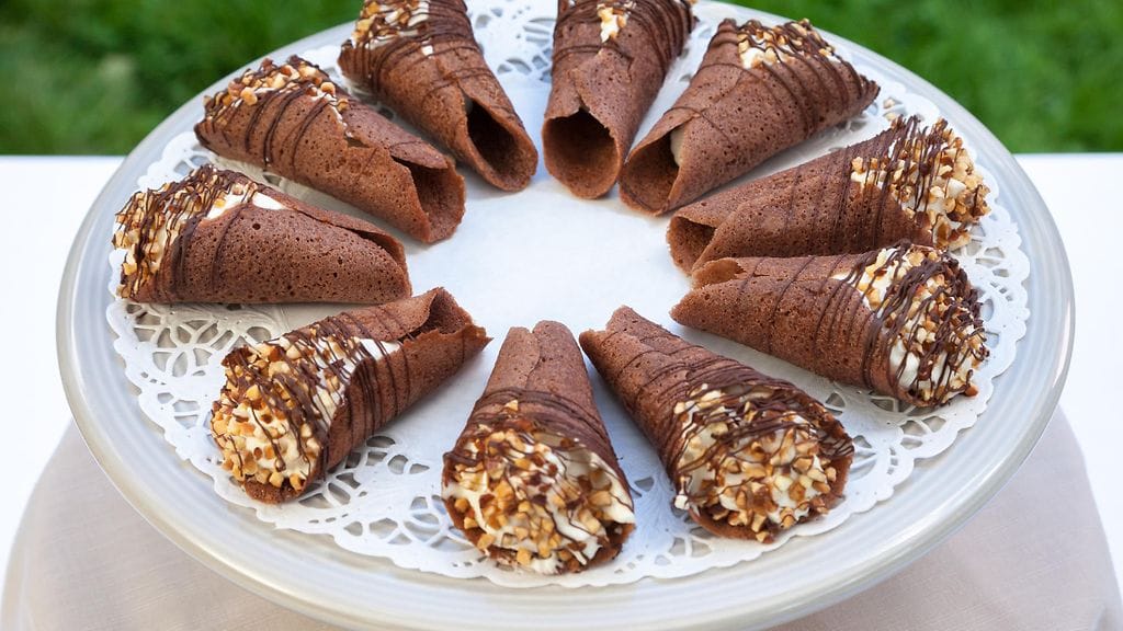 Ota levyt yksitellen uunista ja muotoile heti cannolien muotoon eli kartion malliseksi rullaksi. Tähän on olemassa leivontakaupoissa myös muotteja jolloin aikaa säästyy ja vaivaa. Laita rulla snapsilasiin tai pullon kaulaan jäähtymään jotta muoto säilyy. Jatka paistamista neljä levyä kerrallaan, kunnes koko taikina on paistettu.