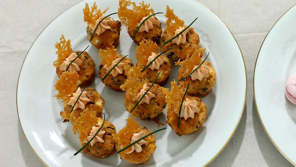 MUFFINSSIT: Voitele minimuffinssivuoka. Aloita leivokset valmistamalla muffinssit. Ruskista peuran jauheliha lisää joukkoon pieneksi pilkottu pekoni ja paista kypsäksi. Siirrä lihat pois paistinpannulta ja kuullota pieneksi pilkotut paprikat. Jätä jäähtymään. Murustele feta pieniksi paloiksi. Pilko ruohosipuli pieniksi paloiksi. Sekoita munat, kermaviili ja suola keskenään. Lisää joukkoon sulatettu voi. Sekoita vehnäjauhot ja leivinjauhe keskenään ja sekoita ne nopeasti munaseoksen joukkoon. Sekoita lopuksi lihaseos, paprikat, feta ja ruohosipuli taikinan kanssa nopeasti. Laita taikina vuokaan ja paista 225 asteisessa uunissa 10-15 min.