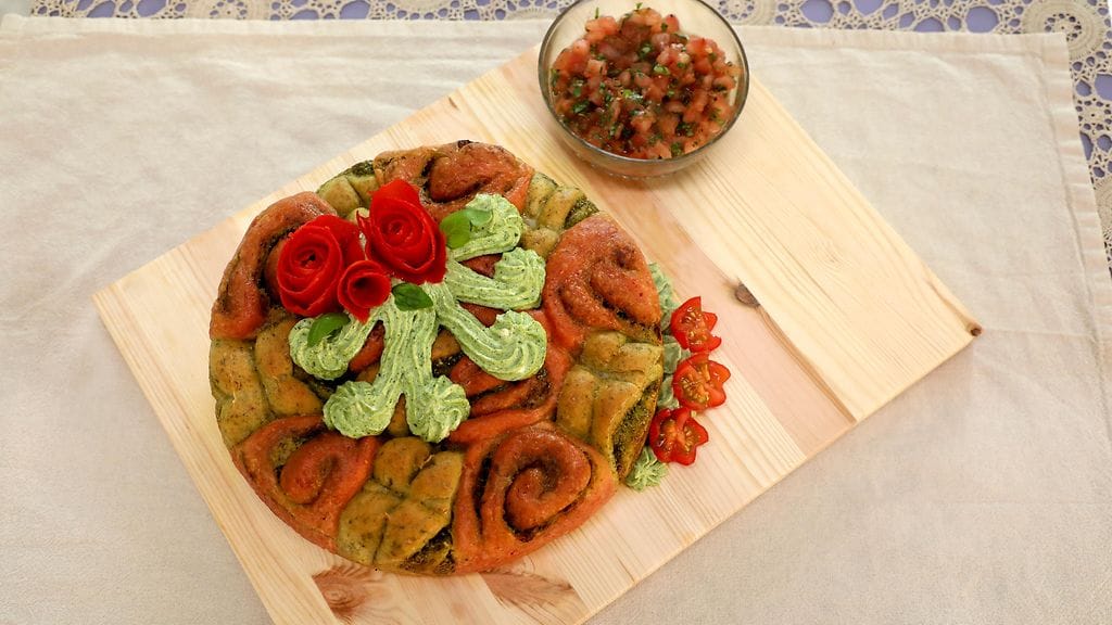 KORISTELEIVÄN KORISTELU: Kun leipä on jäähtynyt, pursota pestokuorrutteella kuusisakarainen tähti koristeleivän päälle. Nosta isot tomaattiruusukoristeet tähden keskelle. Laita koristeiden väleihin basilikan lehtiä. Sommittele pienet tomaattiruusut tähtien sakaroille.