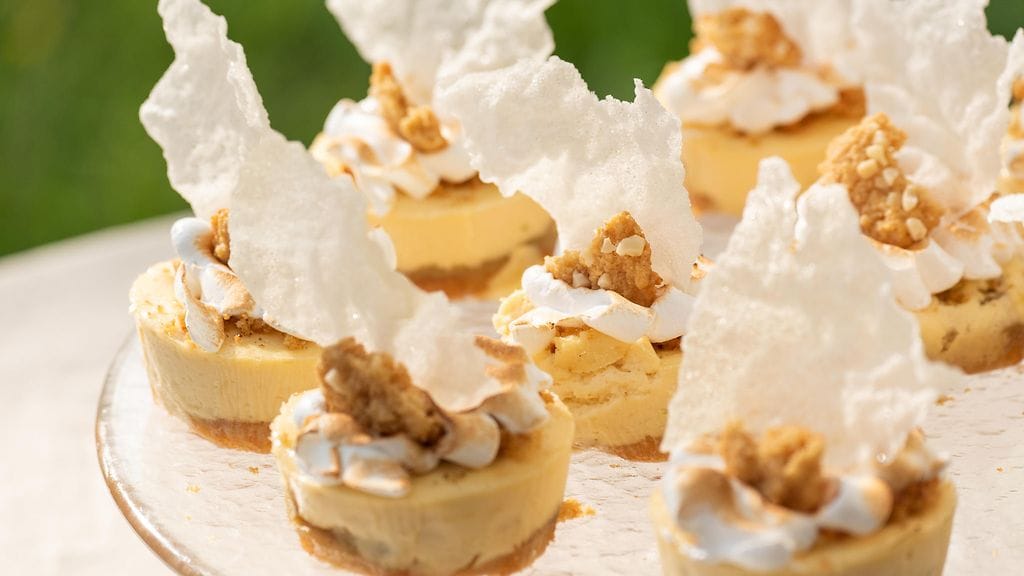 ITALIALAINEN MARENKI: Kuumenna vesi ja sokeri kattilassa 120-asteiseksi. Käytä digitaalista lämpömittaria mittaamaan lämpötila. Älä sekoittele seosta. Vatkaa valkuaiset kovaksi vaahdoksi. Lisää valkoviinietikka. Kaada kuuma sokeriliemi ohuena nauhana valkuaisvaahtoon samalla suurella teholla vatkaten. Pienennä sitten vatkaustehoa ja jatka vatkaamista, kunnes marenki on noin 37 asteista. Lisää joukkoon ripaus inkivääriä. Laita valmis marenki pursotuspussiin. Pursota marenkia juustokakkusten päälle siten, että juustokakun reuna jää näkyviin. Paahda marenki vaaleanruskeaksi kaasupolttimella.