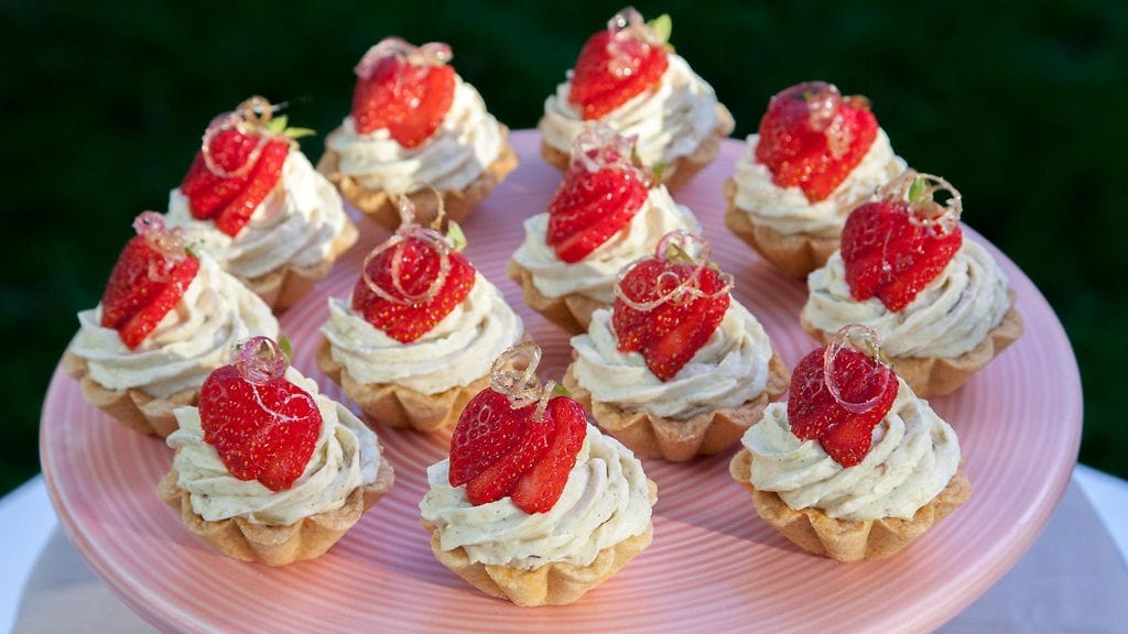 Tee pohja: Mittaa vehnäjauhot, sokeri ja leivinjauhe kulhoon ja sekoita. Paloittele sekaan voi ja nypi seos murumaiseksi. Lisää keltuainen ja vähän kermaa ja sekoita nopeasti tasaiseksi. Painele taikina tartalettivuokiin ja laita vuoat pakastimeen noin 20 minuutiksi. Paista pohjia uunin keskitasolla, 200° noin 12 minuuttia. Irrota kuoret vuoista jäähtyneinä. Käytä apuna hammastikkua jos eivät meinaa irrota.