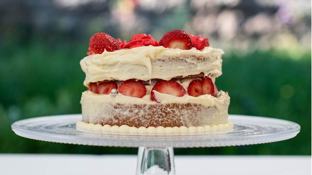 RUUSUT: Pursota punaisesta kreemistä ruusuja kakkuneulalle, siirrä kylmään ja aseta kakun päälle ennen tarjoilua.