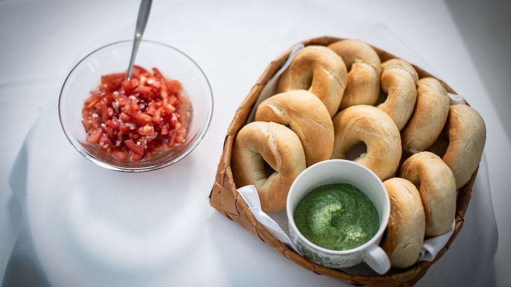 VESIRINKELI: Liuota kädenlämpöiseen veteen hiiva ja mausteet. Alusta jauhot ja öljy taikinaan. Alusta taikina tasaiseksi ja hyvin kiinteäksi. Anna taikinan kohota hyvin. Lisää siihen tarvittaessa jauhoja leivinpöydällä vaivaten. Leivo taikinasta noin peukalon paksuisia nauhoja. Muotoile nauhoista rinkeleitä. Pane rinkelit kiehuvaan, suolalla maustettuun veteen muutama kerrallaan. Nosta reikäkauhalla pellille leivinpaperin päälle heti, kun ne nousevat pintaan. Anna rinkelien kuivahtaa pellillä 10 minuuttia. Paista 250 asteen lämmössä noin 15 minuuttia. Tarjoa nokkospeston ja tomaattisalaatin kanssa.