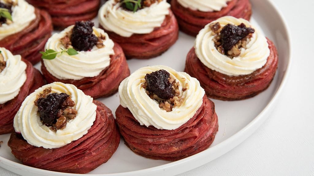TÄYTTÄMINEN JA VIIMEISTELY: Täytä Vol-au-ventit punajuurihillokkeella ja vuohenjuustomoussella. Koristele voitaikina- ja punajuurikoristeilla, pekaanipähkinöillä ja timjamilla.