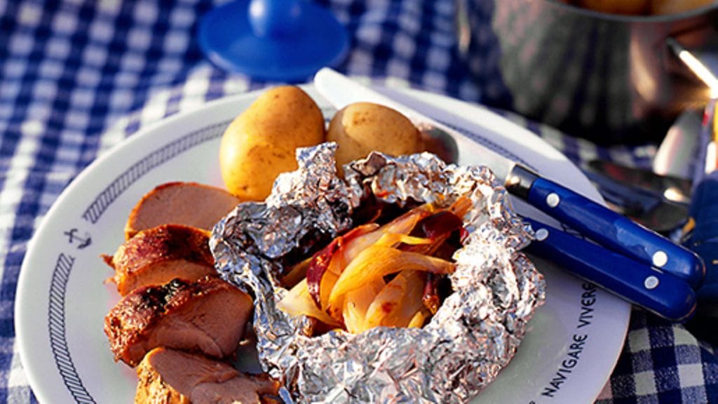 2. Revi rosmariininoksista neulaset. Kuori ja suikaloi sipulit. Leikkaa omenat lohkoiksi ja poista siemenkodat. Kuullota sipulisuikaleet pehmeiksi voissa paistinpannussa. Pane omenalohkot mukaan pannulle hetkeksi. Levitä neljä folioarkkia n. 20 x 20 cm työpöydälle ja jaa omenalohkot, rosmariinineulaset ja sipulisuikaleet arkeille. Mausta suolalla ja pippurilla ja tipauta muutama tippa öljyä kullekin. Kääri paketit kiinni.