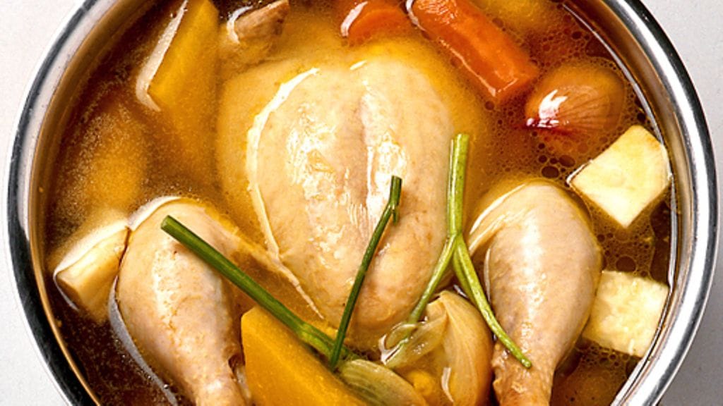 3. Nosta broileri liemestä ja pidä se lämpimänä. Keitä lientä kokoon, niin että sitä on jäljellä noin 1 litra. Jäähdytä liemi. Riisu broilerilta nahka ennen tarjoilua ja leikkaa liha viipaleiksi. Tarjoile keitetyt juurekset lisänä.