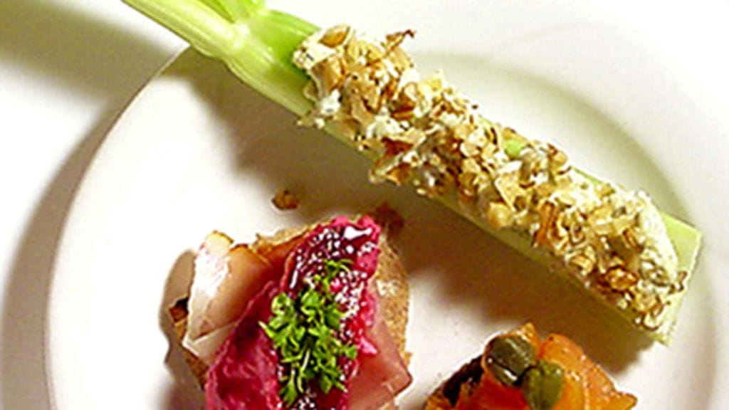 2. Selleriä sinihomejuuston ja saksanpähkinöiden kera: Raasta sinihomejuusto karkeasti. Sekoita juusto ja ranskankerma. Leikkaa sellerinvarret 10 cm pituisiksi paloiksi. Täytä palat juustoseoksella, ripottele päälle saksanpähkinärouhetta.