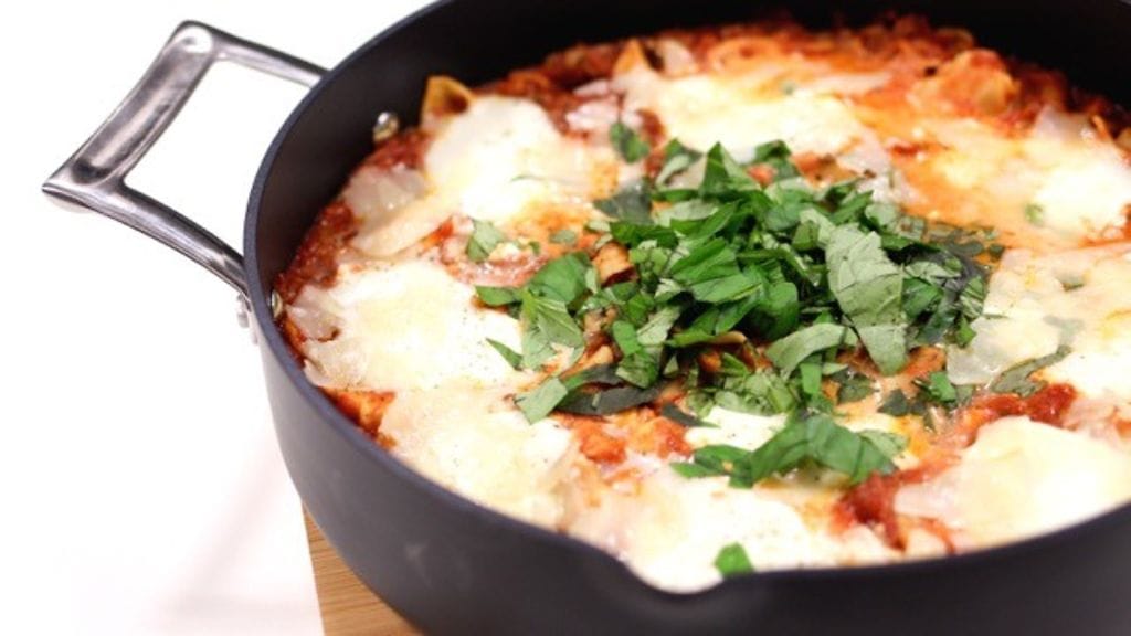 Lisää jauhelihan joukkoon tomaattipyree, -murska, lihaliemikuutio ja oregano, sekoita hyvin. Taittele lasagnelevyt suurin piirtein kahtia, ja lisää pannulle niin, että ne peittyvät kastikkeeseen. Peitä kannella ja anna pastan hautua kypsäksi, noin 15 minuuttia.