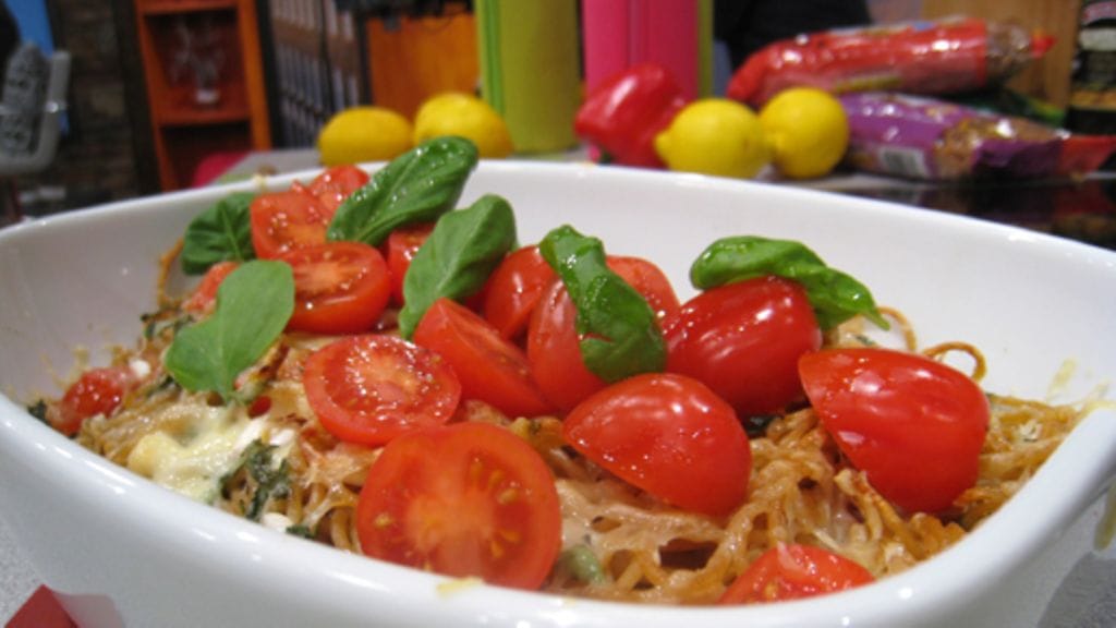 Kuorruta uunissa niin, että juusto saa hieman väriä. Koristele annos lopuilla tomaateilla ja basilikanlehdillä ja kiillota pinta oliiviöljyllä.