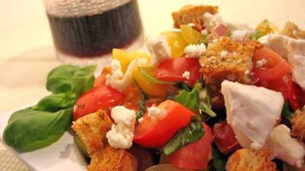 Vispaa kastikeainekset voimakkaasti sekaisin. Sekoita tomaatit ja basilika (silppuna) isossa kulhossa, lisää salottisipulit ja sitruunamehu. Kaada kastike päälle ja sekoita kunnolla. Ripottele päälle vuohenjuusto ja krutongit ennen tarjoilua.