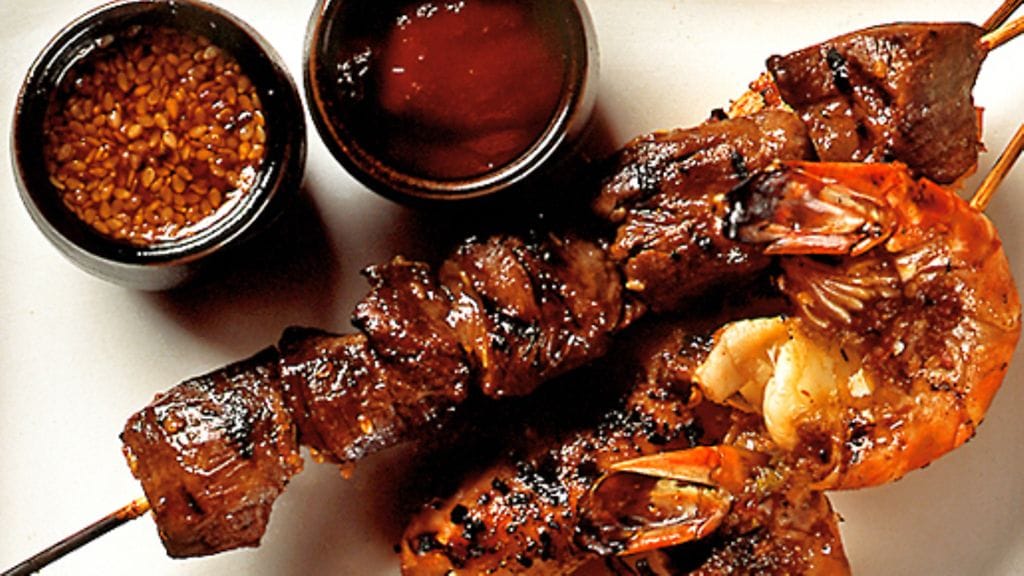1. Kuori valkosipulinkynsi ja inkivääri. Raasta kumpikin kulhoon ja sekoita yhteen soijan kanssa. Kuutioi lihat ja laita eri lajit omiin kulhoihinsa, katkaravut omaansa. Jaa marinadi kaikkiin kulhoihin. Pane ne viileään marinoitumaan vähintään kahdeksi tunniksi. Laita vartaat likoamaan.
