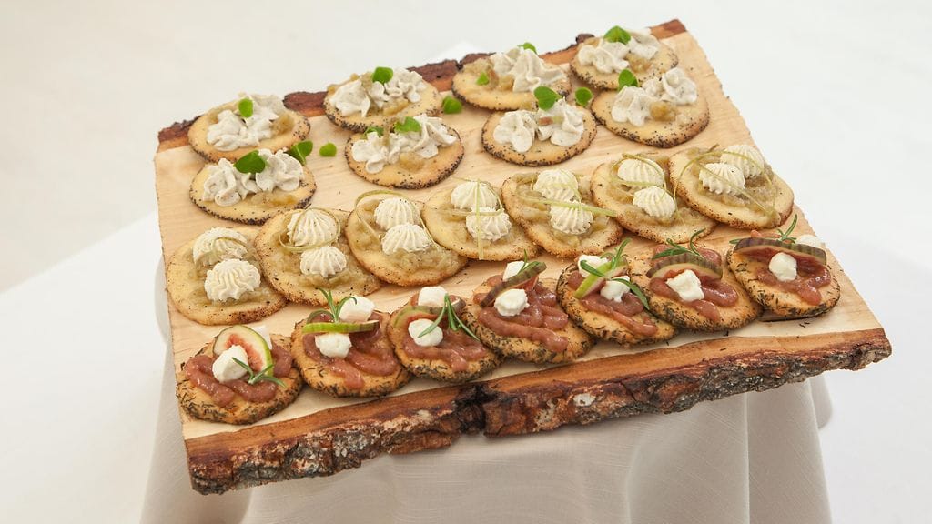 Sekoita aineet kattilassa ja kiehauta. Anna kiehua hiljalleen noin 10 minuuttia. Jäähdytä. Levitä hilloa keksien päälle. Vatkaa vuohenjuustosta notkeaa. Tarvittaessa lisää tuorejuustoa hiukan joukkoon. Pursota keksien päälle. Viimeistele tuoreella viikunalla, rosmariinilla.