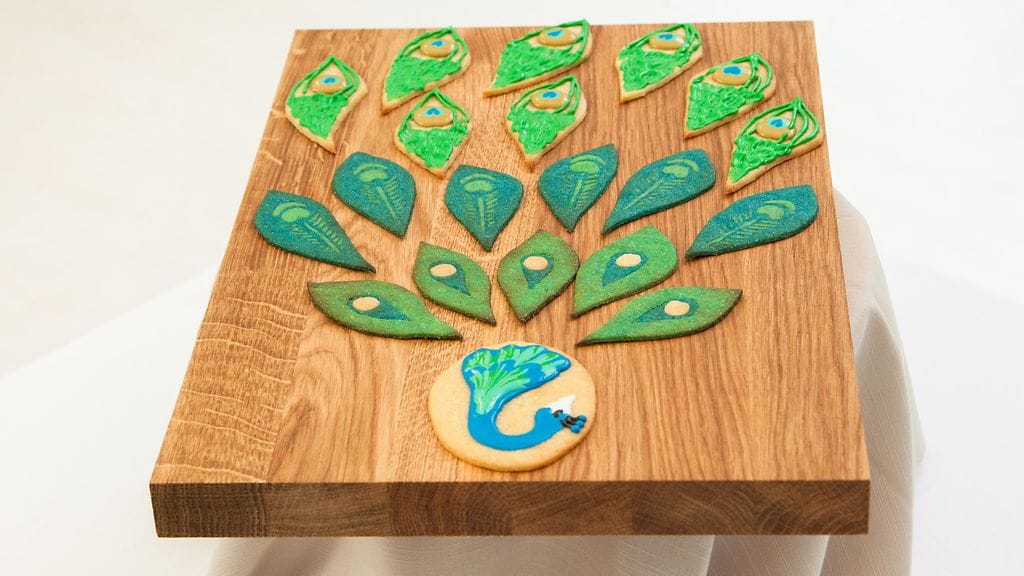Kaaviloi taikina 3-5 mm paksuiseksi levyksi. Leikkaa levystä vapaalla kädellä pisaran mallisia, n. 11 cm pitkiä keksejä 8 kpl ja yksi n. 10 cm korkea soikio. Laita leivinpaperoidulle pellille.