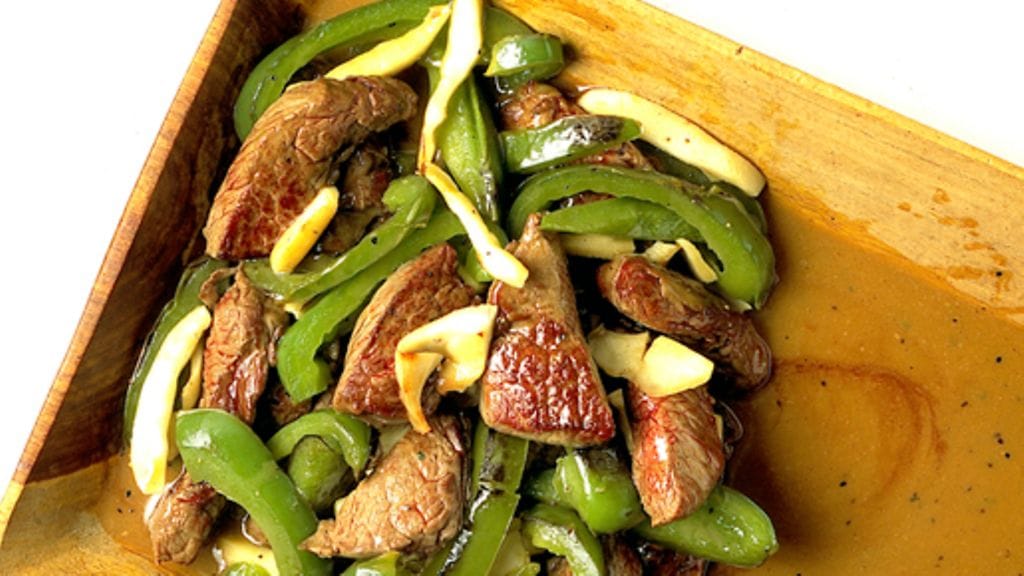 3. Kuumenna öljy paistinpannulla kohtuullisen kuumaksi ja lisää joukkoon suola, pippuri, puristetut valkosipulinkynnet ja cayennenpippuri. Paista lihaa kaksi minuuttia ja sekoita sitten joukkoon paprikasuikaleet ja kookosraaste. Jatka paistamista vielä 2-3 minuuttia. Kaada kastike lihojen päälle ja kiehauta vielä kerran.