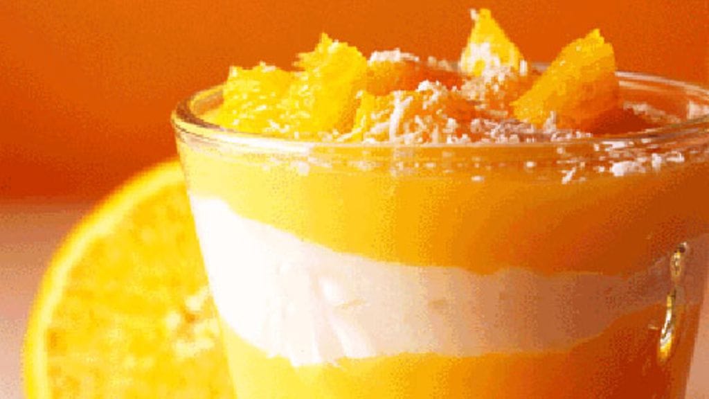 Lisää paloiteltu appelsiini. Jäähdytä kiisseli. Annostele annosmaljoihin kerroksittain kookos- ja appelsiinikiisseliä. Koristele annokset appelsiinipaloilla ja kookoshiutaleilla.