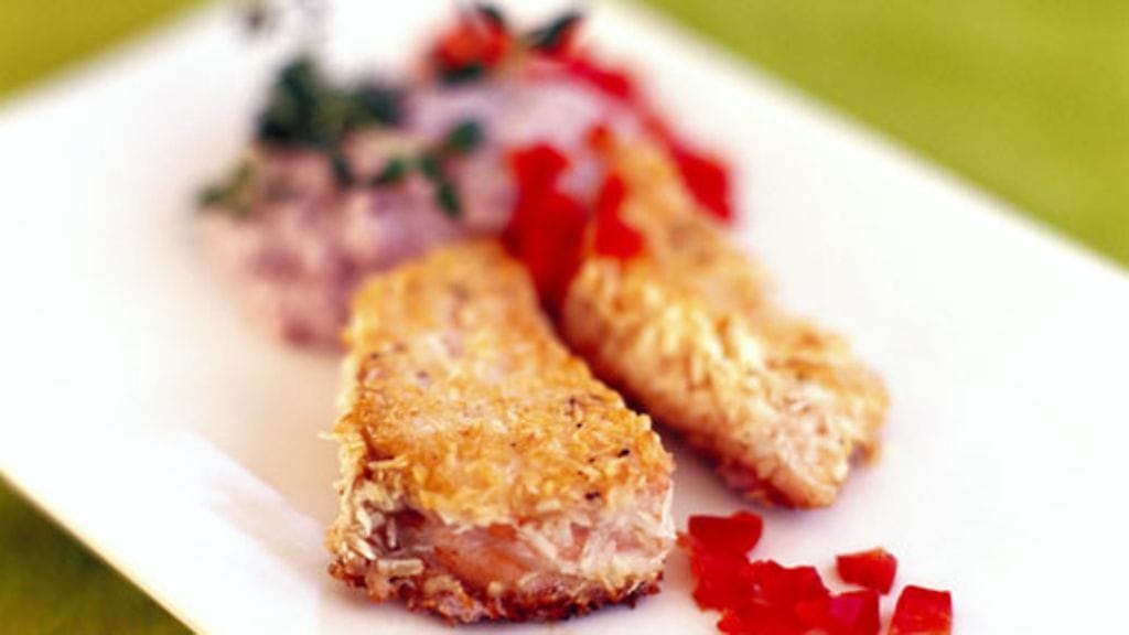 3. Viipaloi lohi neljään osaan. Riko muna ja sekoita sen rakenne tasaiseksi. Kasta lohiviipaleet munassa ja sitten kookoshiutaleissa.