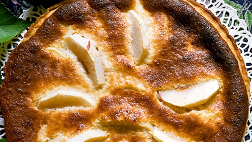 3. Laita suurin osa omenalohkoista vuokaan. Vatkaa munat ja sokeri valkoiseksi. Lisää ranskankerma, kookos ja vaniljasokeri. Kaada taikina omenoille, pistele loput omenalohkot päälle.