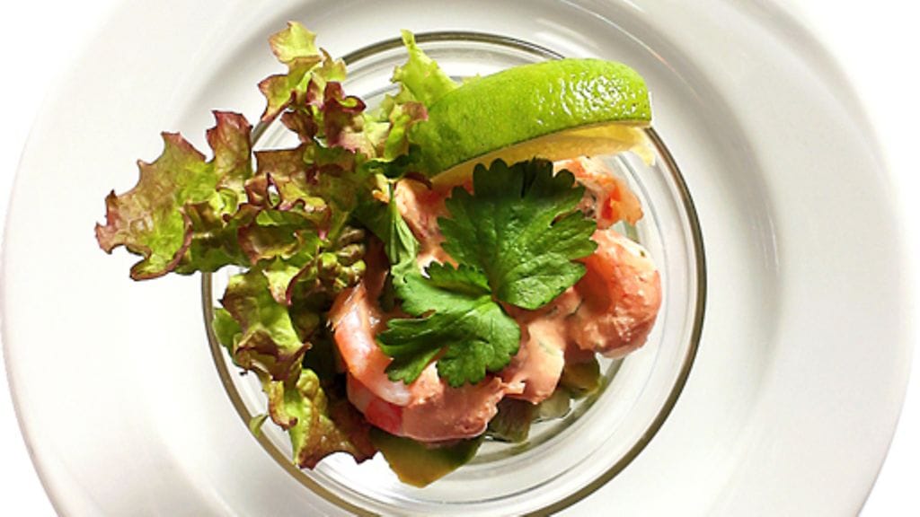 2. Kuori ja hienonna avokado ja sekoita se sitruunamehuun. Lado salaatti, kurkku ja katkaravut kerroksittain cocktaillasiin. Kaada päälle kastiketta.
