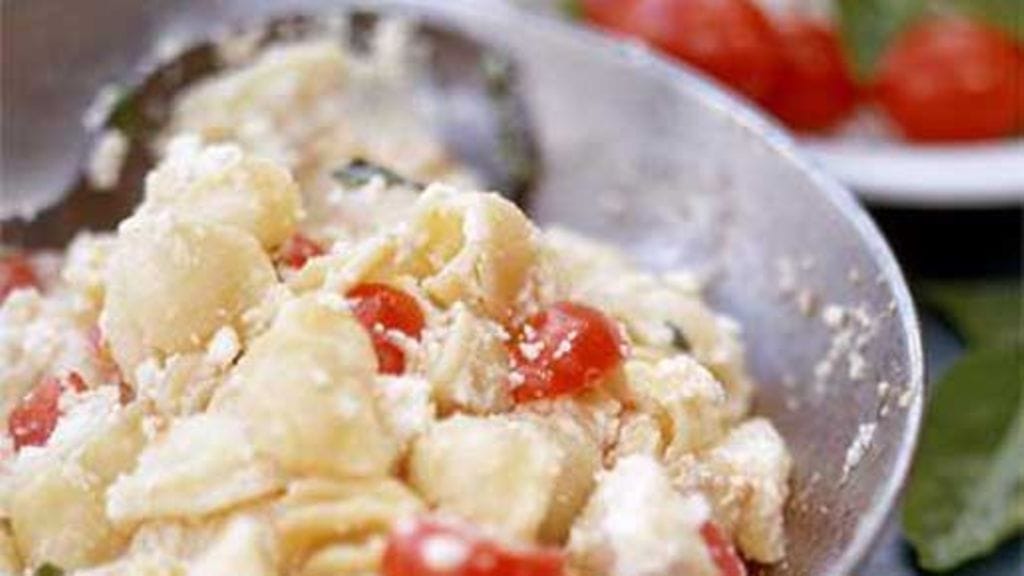 - Lisää keitetty pasta ja ricotta-juusto pannulle. Kaada joukkoon hiukan pasta vettä; vesi rikkoo ricotta-juuston ja laimentaa kastiketta. Kastikkeenhan pitää olla pehmeää, ei kuivaa.