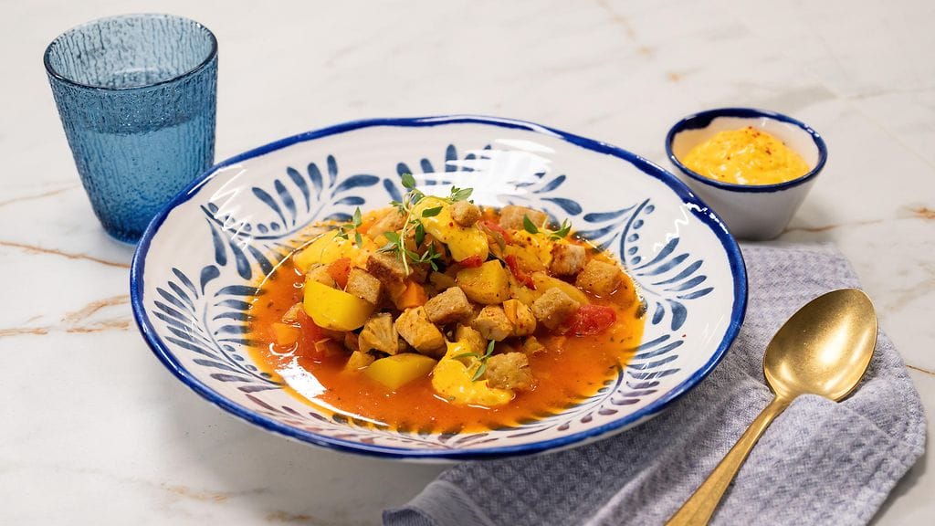 - Kaada kattilaan tomaattimurska, vesi ja sitruunamehu. Lisää kalaliemikuutio ja kiehauta. Keitä kunnes juurekset ovat pehmenneet.