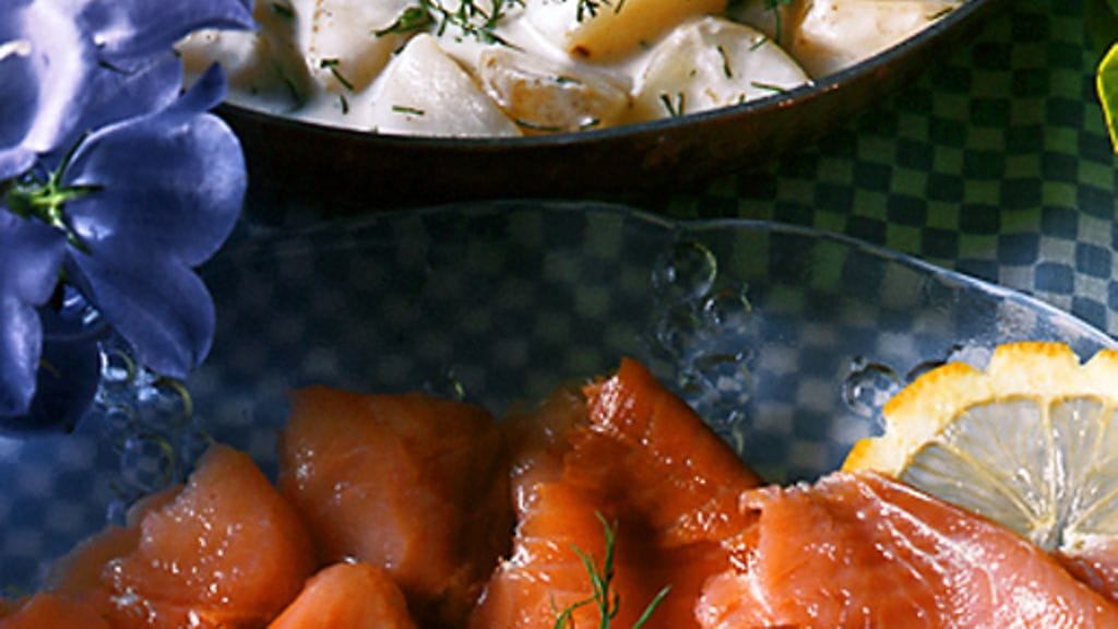 3. Kuori ja kuutioi perunat ja anna niiden lämmetä täysin kastikkeessa. Sekoita mukaan tilli. Leikkaa lohi ohuiksi viipaleiksi, koristele tillillä ja sitruunalla.
