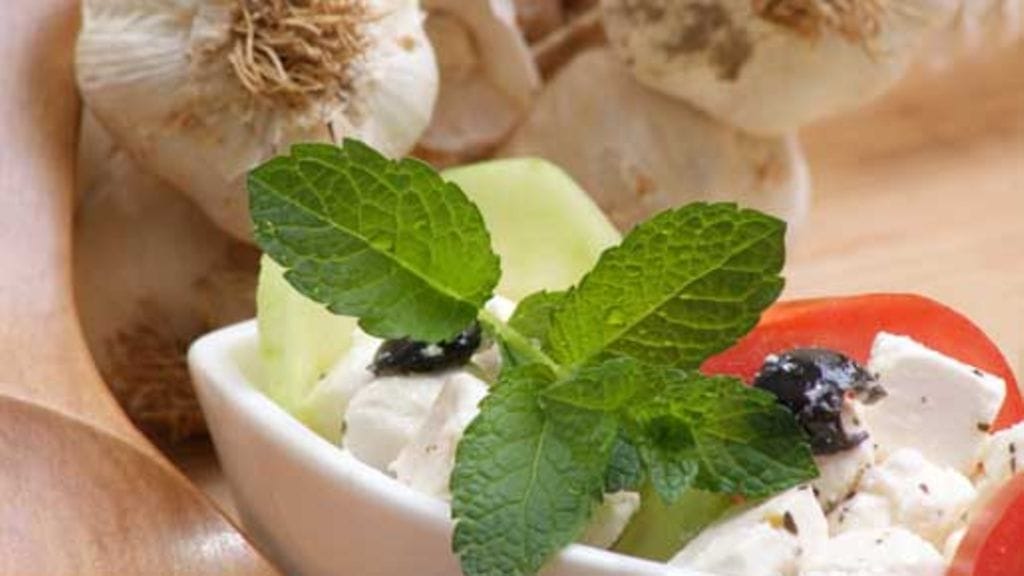 2. Kuori peruna ja viipaloi se hyvin ohuesti. Lado viipaleet vuoan pohjalle. Purista kesäkurpitsaviipaleista ylimääräinen neste ja lado viipaleet perunoiden päälle. Murusta fetajuusto päälle. Vatkaa munat ja maito, purista mukaan valkosipuli ja mausta pippurilla ja timjamilla.