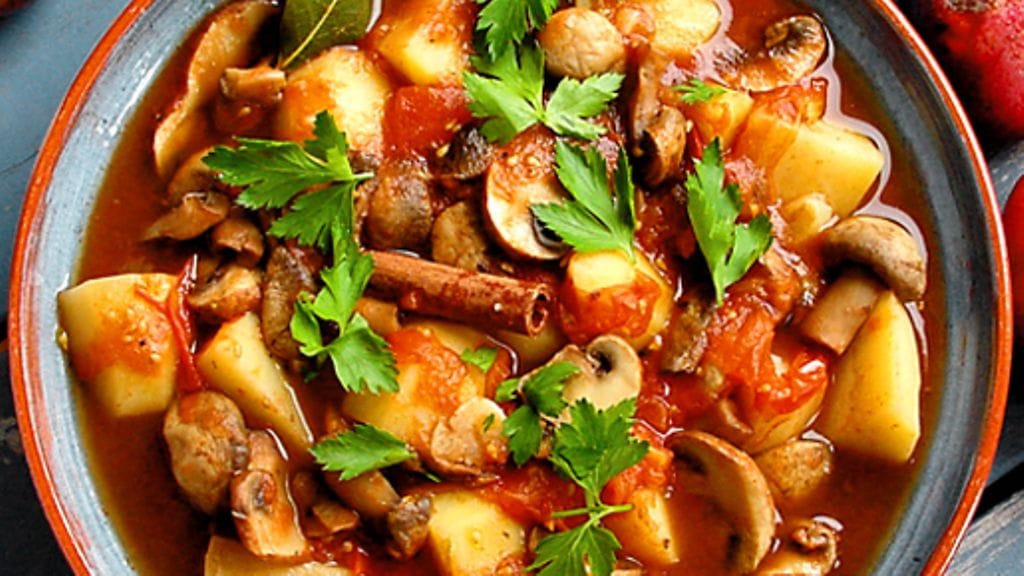 1. Huuhtele ja leikkaa herkkusienet isohkoiksi paloiksi. Kuori perunat ja leikkaa lohkoiksi. Huuhdo ja paloittele tomaatit. Viipaloi valkosipuli.