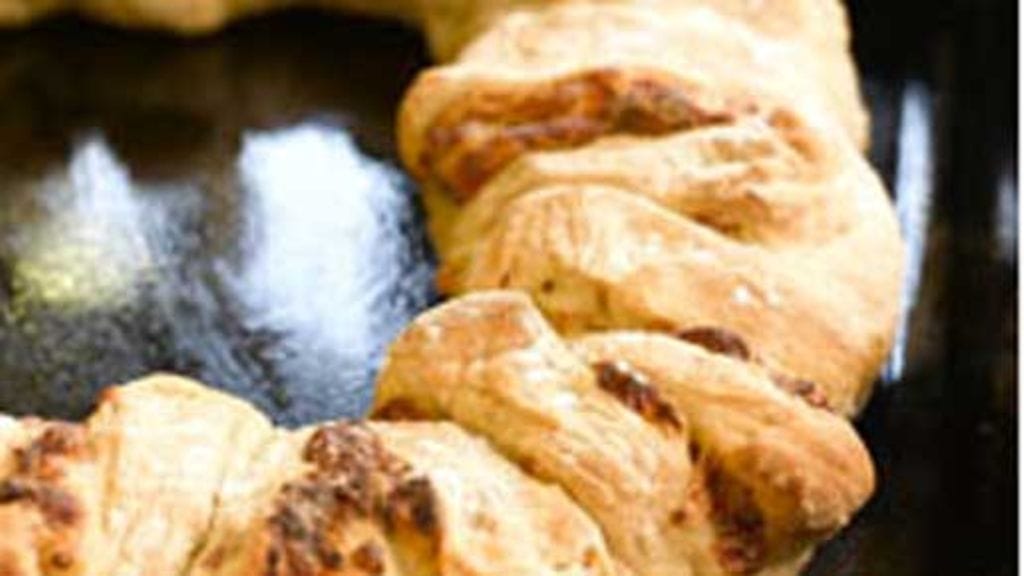 Kaaviloi kohonnut taikina 30 x 60 cm:n levyksi. Levitä täyte levylle ja kääri rullalle kääretortun tapaan. Sulje saumakohta nipistäen hyvin yhteen ja kääntämällä se alaspäin. Nosta rulla leivinpaperille uunipellille ympyränmuotoon ja yhdistä päät toisiinsa. Leikkaa saksilla viiltoja 2-3 cm:n välein. Anna kohota lämpimässä hyvin. Paista 200 asteisessa uunissa 25-30 min.