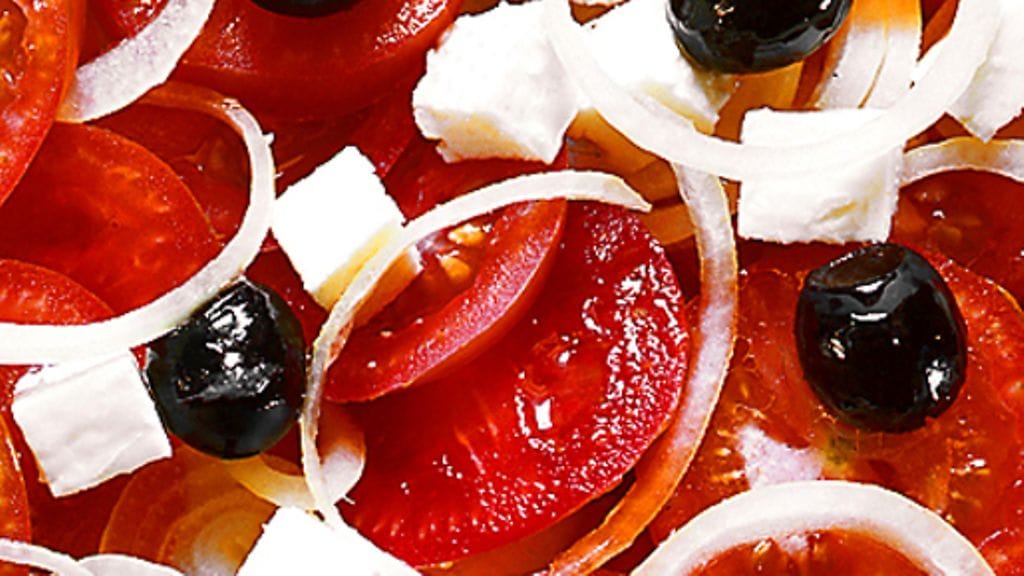 3. Asettele tomaatit, sipulit, oliivit ja feta syvälle vadille, kaada päälle kastike. Sekoita ja tarjoile.