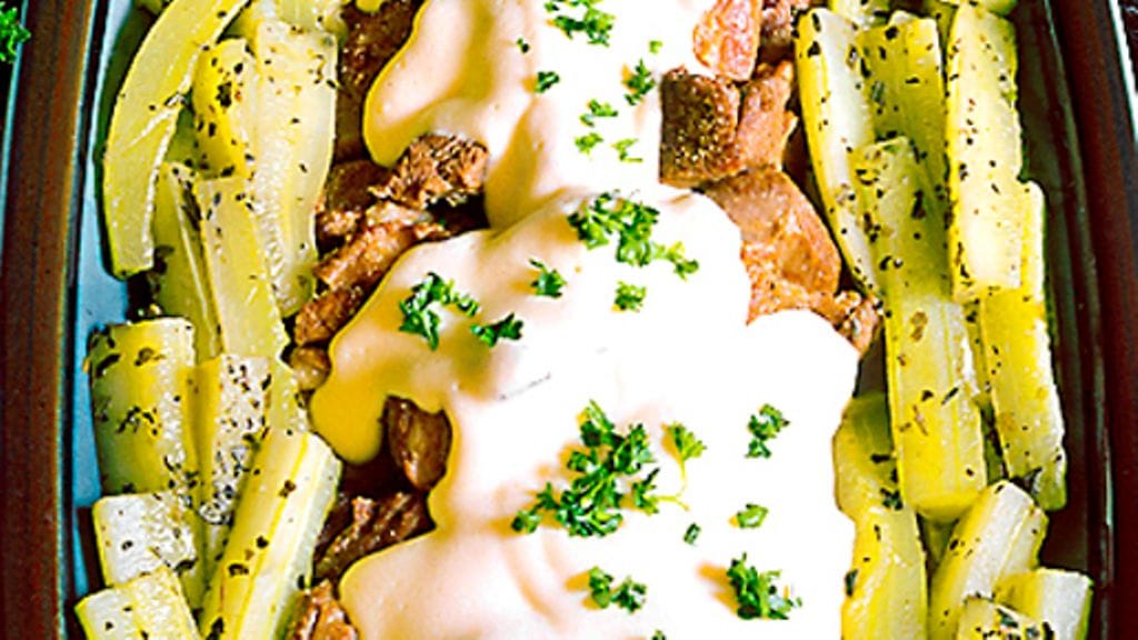 3. Ryhmittele lihat ja kurkut vadille ja kaada kastike lihan päälle. Ripota pinnalle persiljaa ja tarjoile puristetun perunan kanssa.