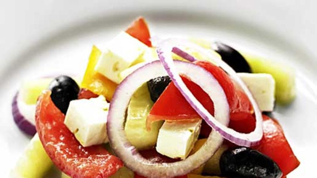 2. Kuori ja viipaloi punasipuli ohuelti. Halkaise paprika, poista siemenet ja paloittele karkeahkosti. Sekoita keskenään tomaatit, paprika, kurkku, sipuli, oliivit ja murennettu feta.