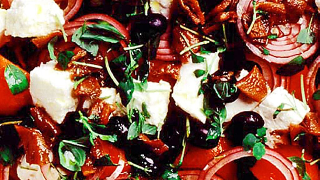 3. Asettele salaatti isolle tarjoiluvadille tai annoslautasille. Tiputtele oliiviöljy salaatille ja ripota päälle oreganoa. Suolaa, jos tarpeen. Tarjoile vastapaistettua maalaisleipää salaatin rinnalla.