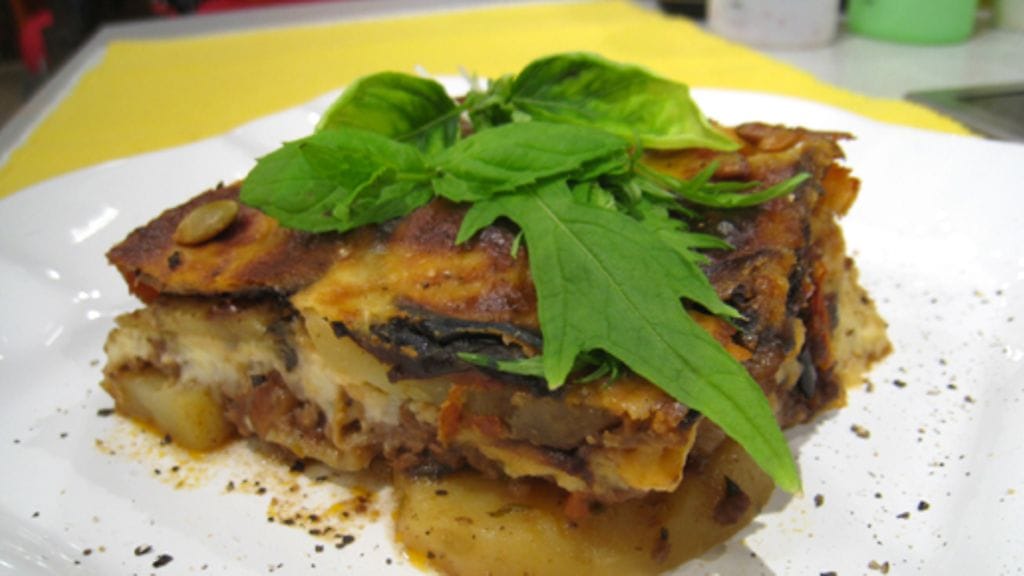 Pirskota munakoisojen päälle hieman oliiviöljyä. Paahda munakoisoja uunissa noin 15 minuuttia, kunnes ne saavat hieman väriä. Anna jäähtyä. Keitä perunat lähes kypsiksi kiehuvassa vedessä. Jäähdytä ja viipaloi.