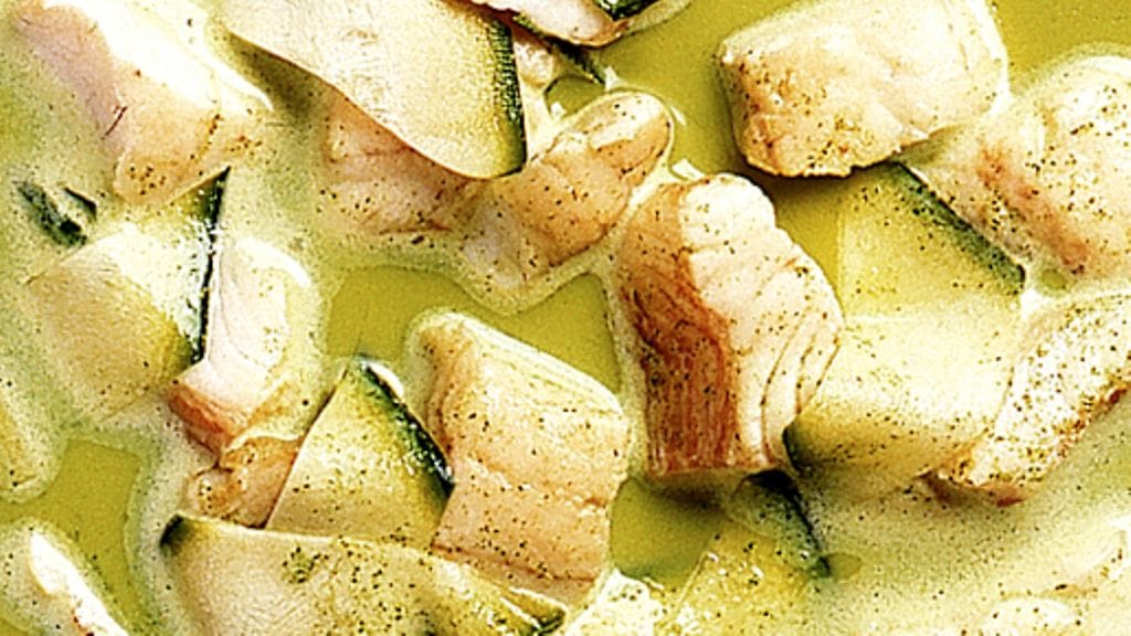 2. Kiehauta kalaliemi ja sekoita joukkoon sauvasekoittimella persilja ja voi, niin keitto saa kauniin vaaleanvihreän värin. Mausta suolalla ja vastarouhitulla pippurilla. Pane joukkoon kuhasuikaleet ja anna kypsyä niin kauan, että kala on läpikotaisin valkoista.