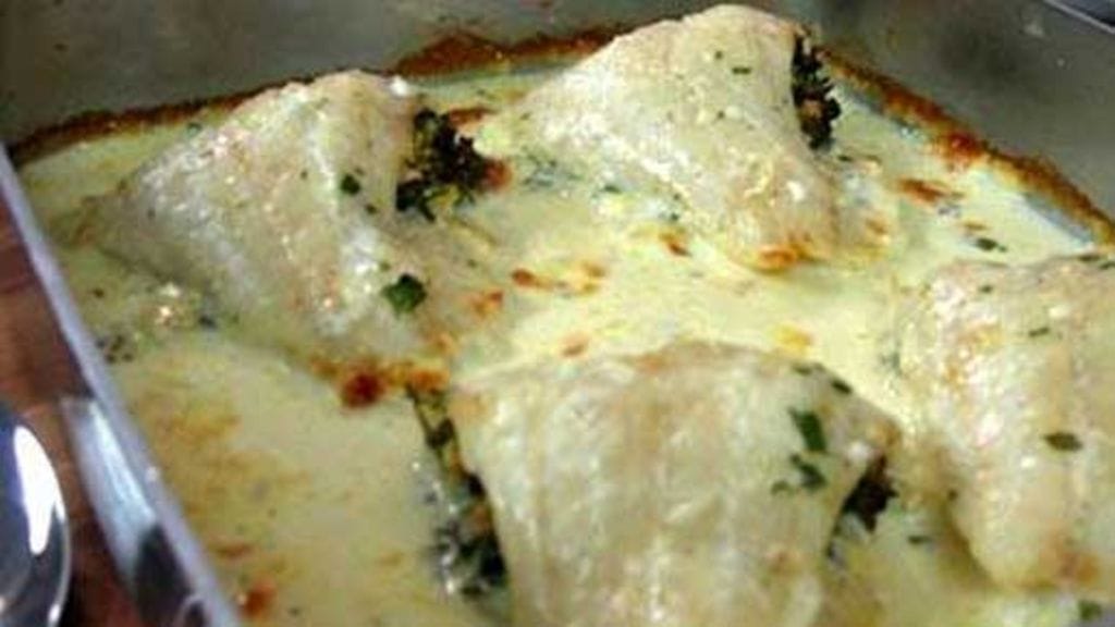Poista fileistä keskiruoto. Taputa fileitä kevyesti kelmun alla. Mausta kuha suolalla ja pippurilla. Lusikoi täytettä kuhafileiden keskelle ja käännä ne taskuiksi.
