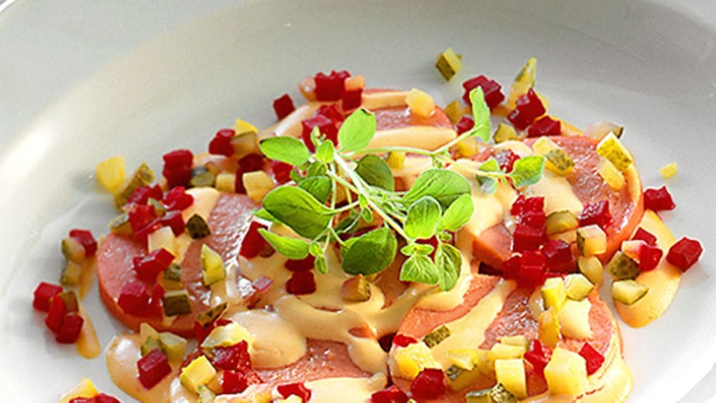 3. Viipaloi makkara. Keitä viipaleita 8 minuuttia lihaliemessä. Nosta makkaraviipaleet lämpimälle tarjoiluvadille, kaada päälle sinappikastike ja sirottele pinnalle sipuli-punajuuri-kurkkuhake. Tarjoa vastakeitettyjen perunoiden kanssa.