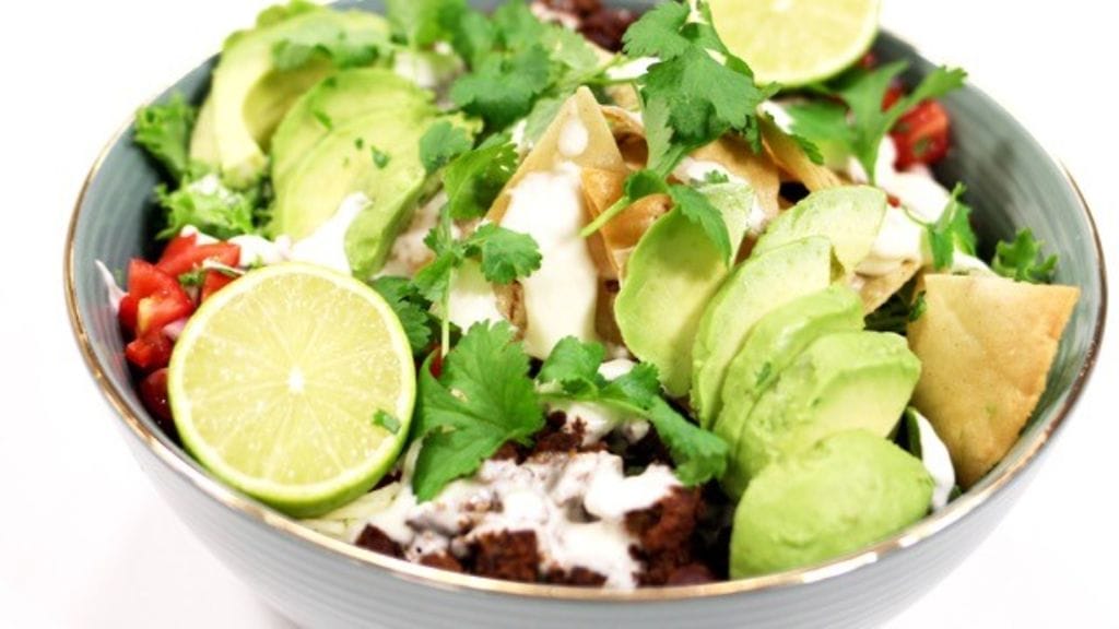 Kuori ja kuutioi avokado. Silppua salaatti.