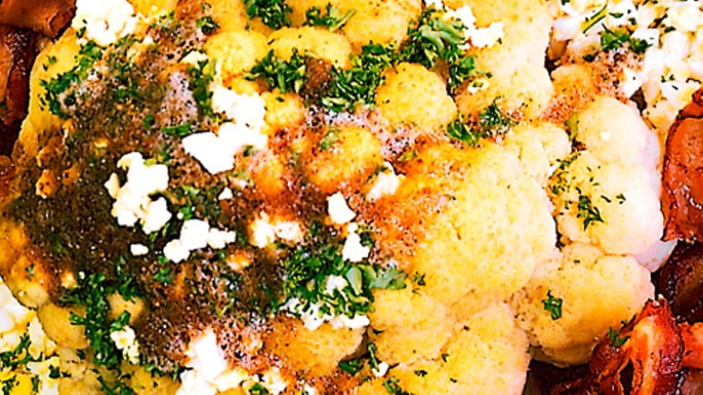 3. Ripottele päälle persiljaa. Paista pekonit. Asettele munasilppua ja pekonia kukkakaalin ympärille.