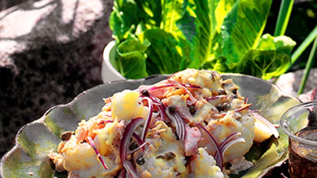 2. Kuori ja silppua munat. Kuori ja suikaloi sipuli. Jaa ne kukkakaalin päälle ja sirottele pinnalle kaprikset. Tarjoile heti.