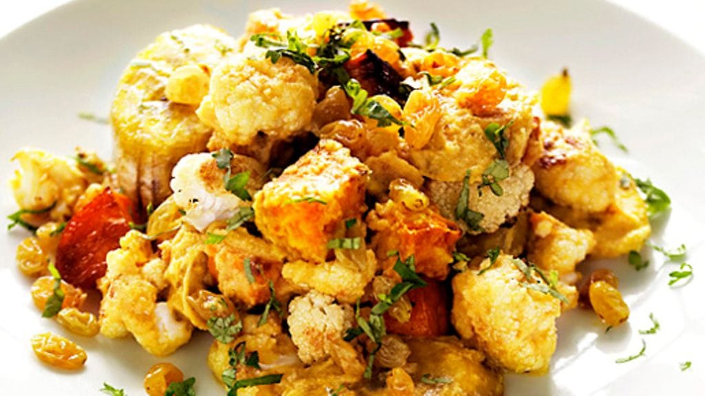 3. Kuori sipuli ja valkosipuli ja silppua. Kuullota sipuleita ja currytahnaa öljyssä kattilassa. Lisää joukkoon kukkakaalinpalat ja siivilöi appelsiinimehu rusinoista. Siirrä rusinat sivuun. Keitä kukkakaalipalat pehmeiksi. Soseuta keitetty kukkakaali mikserissä ja sekoita sose paahdettujen vihannesten, rusinoiden ja korianterin kanssa. Mausta suolalla ja pippurilla.